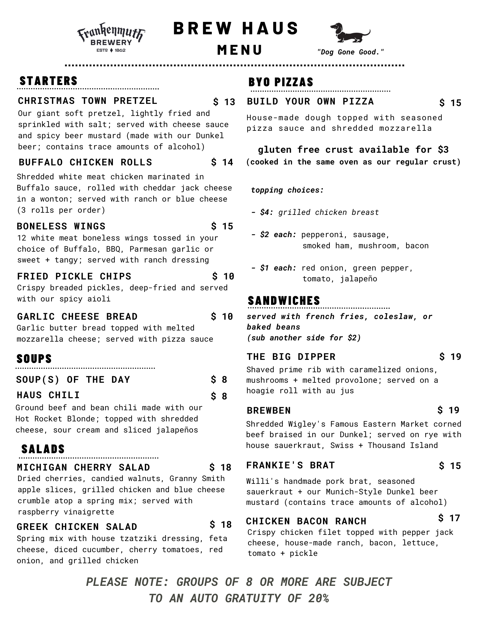 Our restaurant is the heart of the brewery, serving a menu that brings people together. Enjoy handcrafted burgers, Bavarian favorites, and family-style plates made with fresh ingredients. Relax indoors or take in the Cass River view from our outdoor patio. It’s one of Frankenmuth’s best spots to eat, drink, and unwind. Whether you’re here for lunch with the kids or dinner with friends, you’ll always feel welcome.